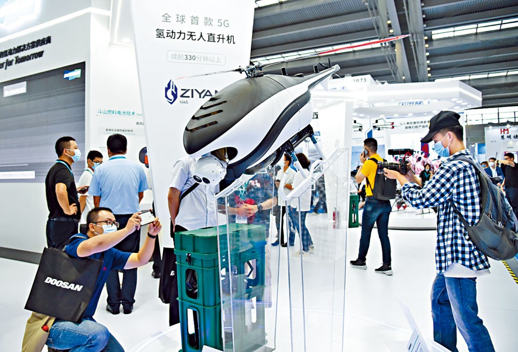 圖為人們在參觀一款續航三百三十分鐘以上的氫動力無人直升機。