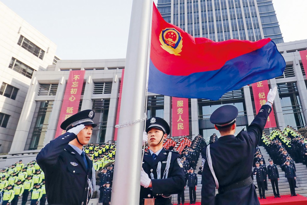 (星島日報報道)昨天(一月十日)是第一個中國人民警察節,公安部部長趙克志要求,要以確保國家安全和社會穩定的優異成績慶祝建黨一百周年。圖為上海公安機關昨天舉行警旗升旗儀式,四百多名公安民警代表前重溫入警誓詞。
