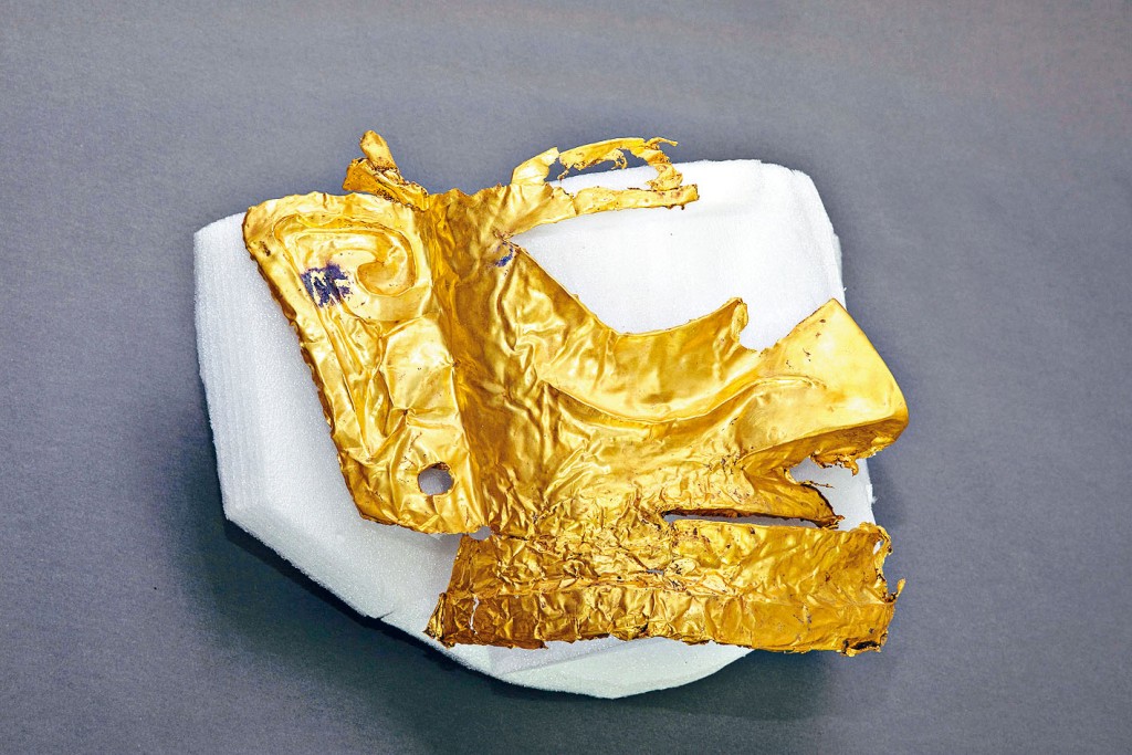 (星島日報報道)國家文物局昨日在四川成都宣布,四川三星堆遺址考古「再驚天下」,考古工作者在三星堆遺址新發現的六座三星堆文化「祭祀坑」,現已出土重要文物超過五百件。圖為考古發掘現場五號「祭祀坑」新出土的殘缺金面具。