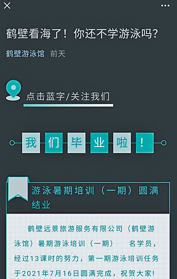 (星島日報報道)河南近日遭受洪災,鶴壁市也是重災區之一。但鶴壁游泳館竟以水災來打廣告,在微信公眾號發布:「鶴壁看海了!你還不學游泳嗎?」(見圖)招生。鶴壁市市場監督管理局認定該游泳館違背社會良好風尚,涉嫌借災難營銷,重罰人民幣二十萬元。