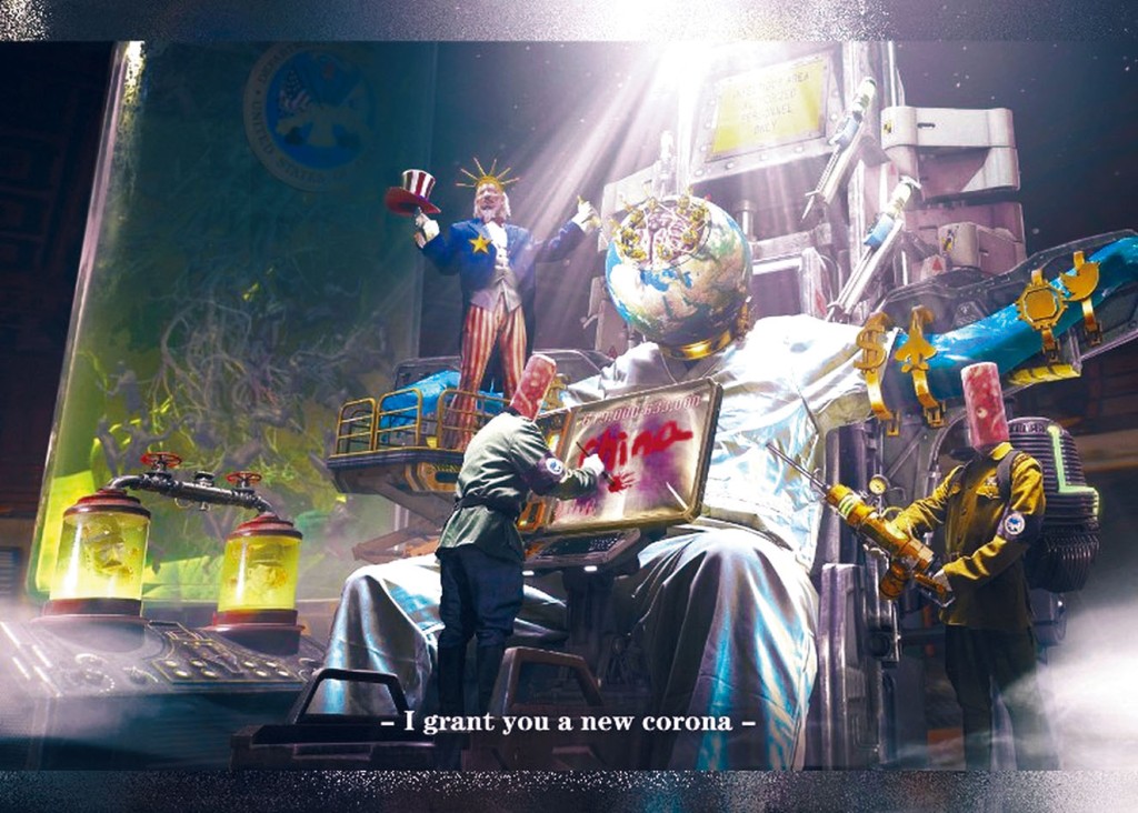 畫的左邊有一名頭戴美國自由神像皇冠的男子正手持針筒,指揮其他人向地球巨人注入毒劑,寓意美國親手把新冠疫情傳播。巨人腳邊有兩名手臂戴有美國德特里克堡生物實驗室臂章的軍官,兩人頭部被取走並浸泡在福爾馬林,身分疑分別是日本七三一部隊長官石井四郎,以及納粹德國教育部長戈培爾。戈培爾有名言:「謊言重複一千遍就是真理。」畫中他正在巨人肺部X光片上手寫「中國」字樣,寓意美國把新冠源頭嫁禍中國。