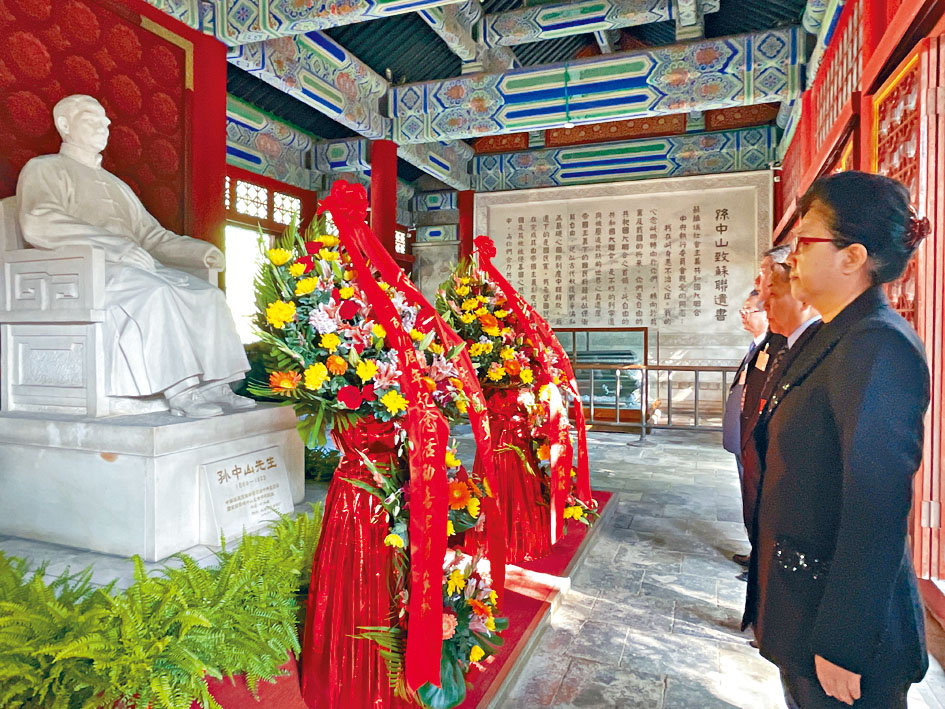 (星島日報報道)十月十日辛亥革命紀念日即將來到。昨天上午,在北京參加辛亥革命一百一十周年紀念活動的辛亥革命先輩後裔、港澳同胞、台灣同胞和海外僑胞代表,到北京西郊的香山碧雲寺的孫中山紀念堂舉行拜謁儀式。圖為嘉賓參訪團成員代表在中山紀念堂敬獻花籃。