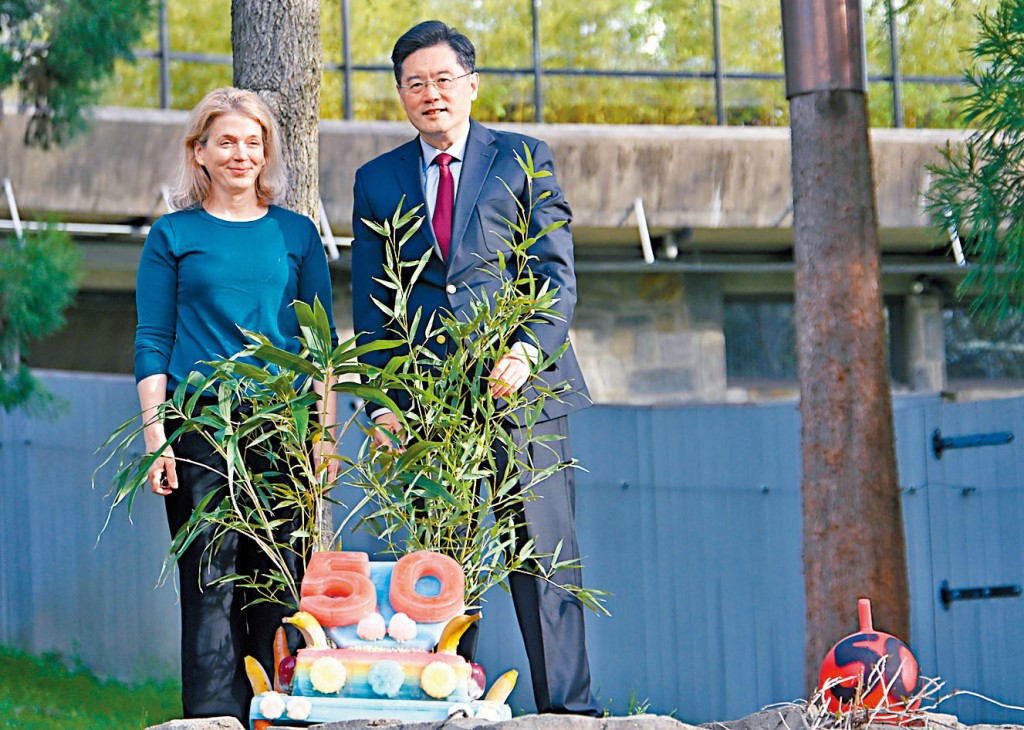 中國駐美國大使秦剛(圖右)在活動現場致辭說,五十年來,中美在大熊貓保護研究合作上不斷取得可喜的成績。大熊貓從五十年前的幾百隻增加到目前一千八百多隻,成功摘帽「瀕危」。這也證明中美攜手努力,可以辦成有利於世界的大事。