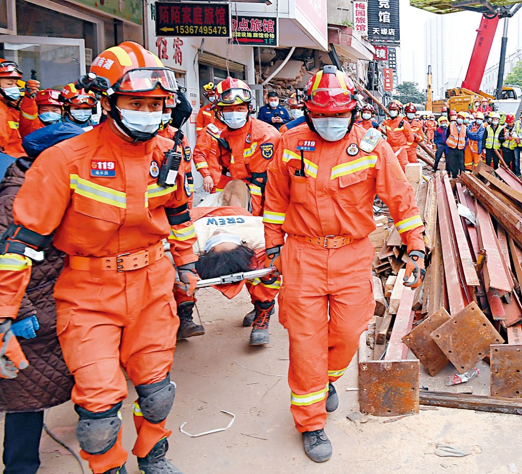 (星島日報報道) 四月二十九日,湖南長沙一幢八層的房屋粉碎性倒塌,造成二十三人被困,另有三十九人失聯。經過五十二個小時的救援,第六名被困人員昨日下午被救出。長沙警方昨日通報事故,指倒塌事故房主、設計施工負責人等九人已被刑拘,有的涉嫌重大責任事故罪,有的出具虛假房屋安全鑒定報告,涉嫌提供虛假證明文件罪。經初步調查,承租戶對房屋進行結構改動。圖為第六名被困者被救出。