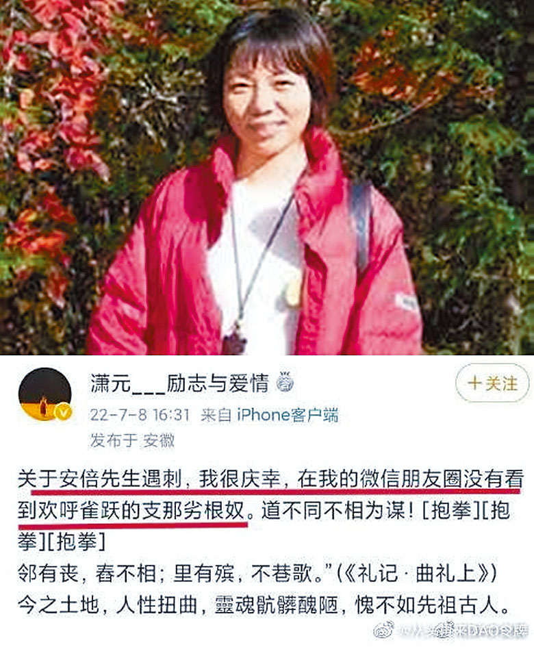 石文瑛(見圖)前日在其用筆名瀟元開設的微博發文:「關於安倍先生遇刺,我很慶幸,在我的微信朋友圈沒有看到歡呼雀躍的支那劣根奴。道不同不相為謀!」