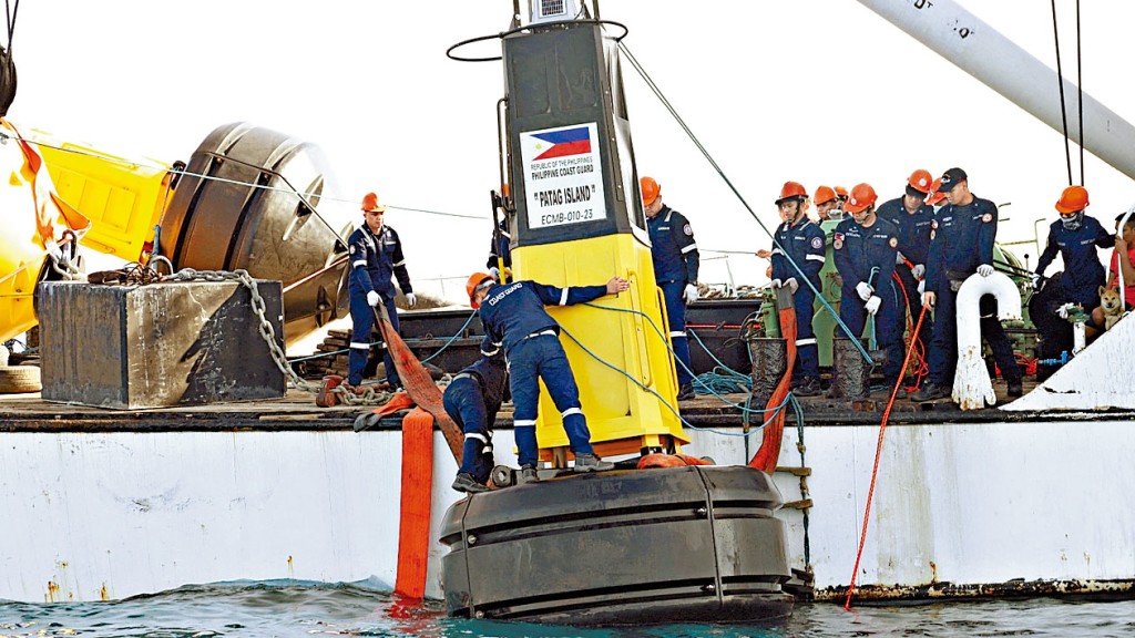 (星島日報報道)菲律賓海警本月中旬在5個南海島礁附近設置浮標(見圖)後,中國交通運輸部昨日宣布,為保障船舶航行及作業安全,該部南海航海保障中心近日在南沙群島火艾礁、牛軛礁和南薰礁附近海域,布設3座燈浮標。