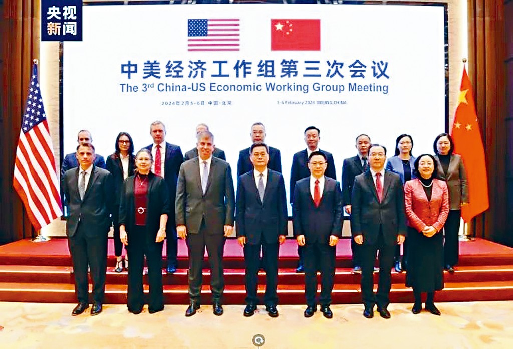 中美經濟工作組2月5日至6日在北京舉行第三次會議,由財政部副部長廖岷和美國財政部副部長尚博共同主持。雙方就兩國宏觀經濟形勢及政策等議題進行深入坦誠交流。中方就美對華加徵關稅、雙向投資限制、制裁打壓中方企業等表達關切。