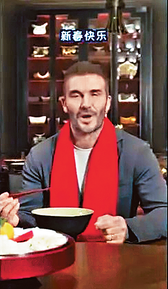 英格蘭球星、美國國際邁亞密班主碧咸昨日在官方微博發布中英文春節祝福視頻。片中他戴紅色圍巾用普通話說:「新春快樂」,還用筷子吃了一口麵。微博配文內,他用中英雙語寫道:「祝大家龍年健康快樂,歡度與家人朋友的時光」。
