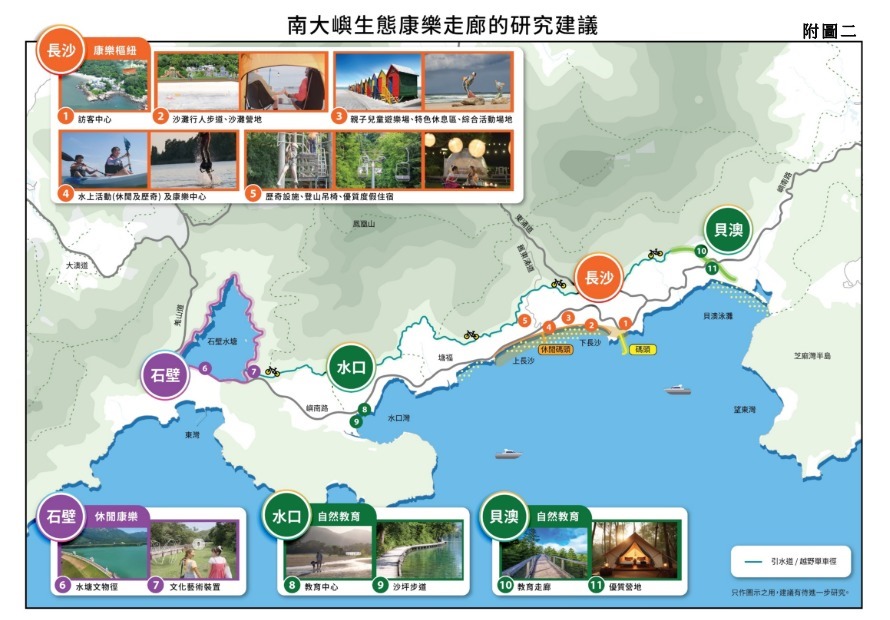 發展局提交的文件,建議對南大嶼貝澳、長沙、水口和石壁的定位各有分工,動態活動集中在長沙,包括設有水上活動及康樂中心、休閒和歷奇水上活動區、沙灘營地、沙灘親子兒童遊樂場、繩索歷奇、登山吊椅、碼頭和優質度假住宿。