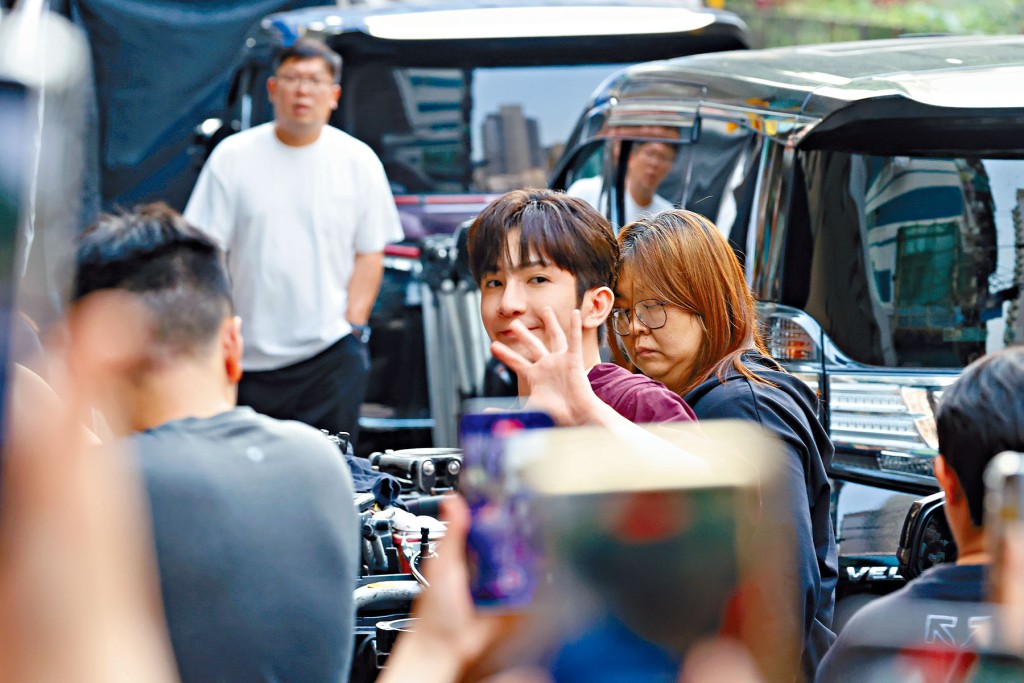 1小時後,戴眼鏡穿中長褸的Edan也現身,他聽到粉絲大叫,亦有回頭看。隨後,換了紅色格仔恤衫的姜濤由表行走出來,兩人前後腳走入在路邊搭起的臨時導演棚看回帶,看完片折返繼續拍。