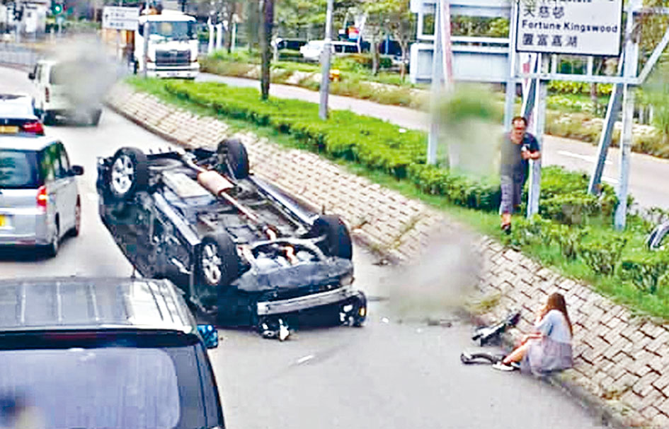 私家車撞壆四輪朝天