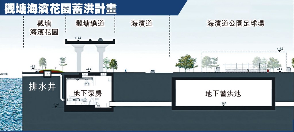 (星島日報報道)觀塘近牛頭角港鐵站一帶,雨水管道排洪能力一直不足,部分街道在暴雨期間較易發生水浸,過去五年的的暴雨期間,曾先後三次出現嚴重水浸記錄;有見及此,渠務署擬在觀塘下游位置的海濱道公園及觀塘海濱花園,分別建造逾二萬二千立方米的地下雨水蓄洪池及地下泵房,於暴雨期間將大部分雨水排出觀塘避風塘。渠務署會採用「一地多用」的理念,善用土地資源。當防洪工程完成後,將於地下蓄洪池之上蓋地面位置重置原有足球場設施。