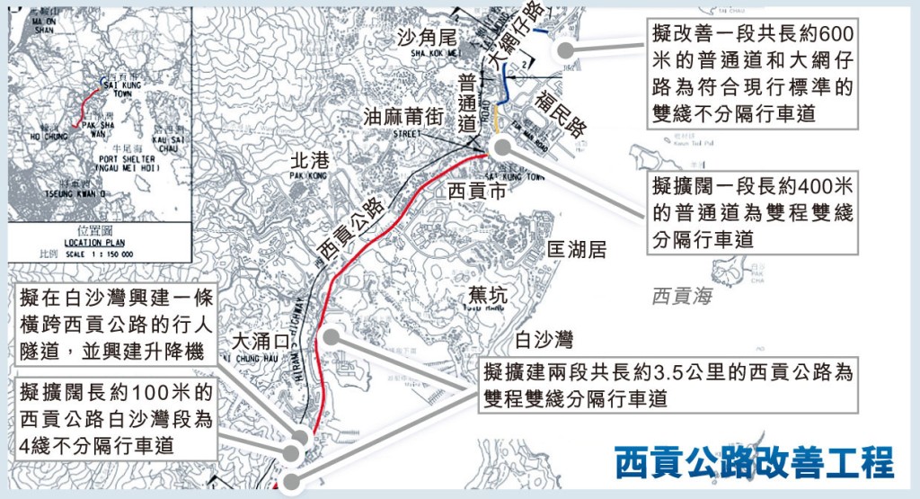 運流局提交的文件顯示,第2期改善工程,包括擴闊匡湖居與白沙灣之間及白沙灣與西貢市之間兩段共長約3.5公里的西貢公路,由現時雙綫不分隔行車道,改為雙程雙綫分隔行車道;以及擴闊長約100米的西貢公路白沙灣段,由現時的雙綫不分隔行車道,改為四綫不分隔行車道等。文件提到,施工範圍將有2145棵樹被砍伐,包括屬珍稀物種的2棵茸莢紅豆及10棵土沉香,並且須收回約11830平方米私人土地。