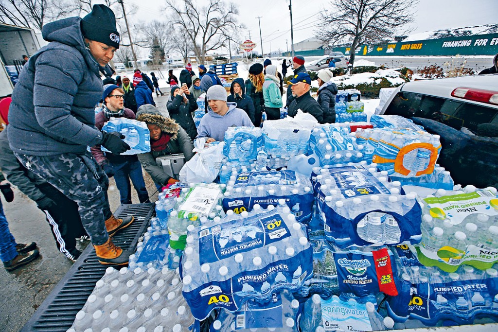 (星島日報報道)美國傳媒周三引述消息報道,密歇根州當局與弗林特市居民達成一項六億美元(約四十七億港元)協議,同意向受鉛水污染而健康受損的居民作出賠償。數千名弗林特市居民對州政府提出法律訴訟,州長惠特梅爾及檢察長奈塞爾的辦公室,為此與居民委任的律師協商逾十八個月。奈塞爾的發言人表示,由於聯邦法院要求各方對和解內容保密,暫時不便對外說明細節。這場沿水災難已經使得這座貧窮、主要族群為非裔的城市,成為政府管理失當的全國象徵。二〇一四年,州政府為了節省經費,將弗林特市自來水源由底特律市自來水公司,改為由弗林特河供應。圖為二〇一六年義工分發樽裝水給居民。