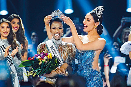 (星島日報報道)南非小姐通齊(Zozibini Tunzi)周日擊敗全球各地九十多名佳麗,在美國亞特蘭大泰勒派瑞片場舉行的選美會中,獲封環球小姐。二十六歲的通齊在新環節結尾演說中博得滿堂彩,她說想為年輕女性賦權,希望她們感到自信。「在我成長的世界,女孩們看起來都與我無異,她們擁有和我一樣的膚色與頭髮,卻從不被世人視為美麗。我想,從今天開始,該停止這樣的想法了。」至於獲得亞軍的是波多黎各小姐安德森,季軍是墨西哥佳麗阿拉岡。圖為上屆環姐冠軍、菲律賓佳麗格雷為通齊戴上后冠。