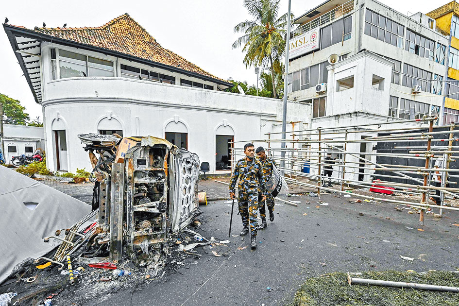 (星島日報報道)斯里蘭卡因經濟急劇滑落引發動亂,前總理馬欣達.拉賈帕克薩的官邸遭數千名示威者包圍,他們無視宵禁令,向馬欣達的官邸投擲十個汽油彈,並破壞官邸大門闖入。馬欣達周二在重裝士兵保護下,倉皇撤離官邸(圖)。
