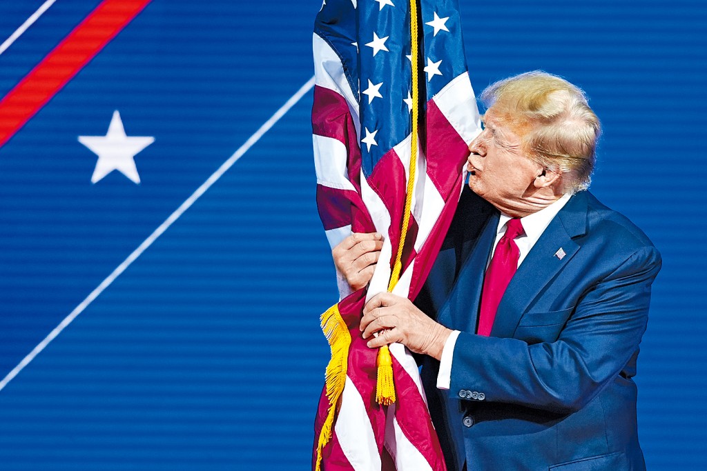 特朗普在共和黨提名戰最初4站全勝,以難以超越的領先優勢邁入3月初的「超級星期二」初選。圖為特朗普周六在馬里蘭州出席保守政治行動會議時吻國旗。