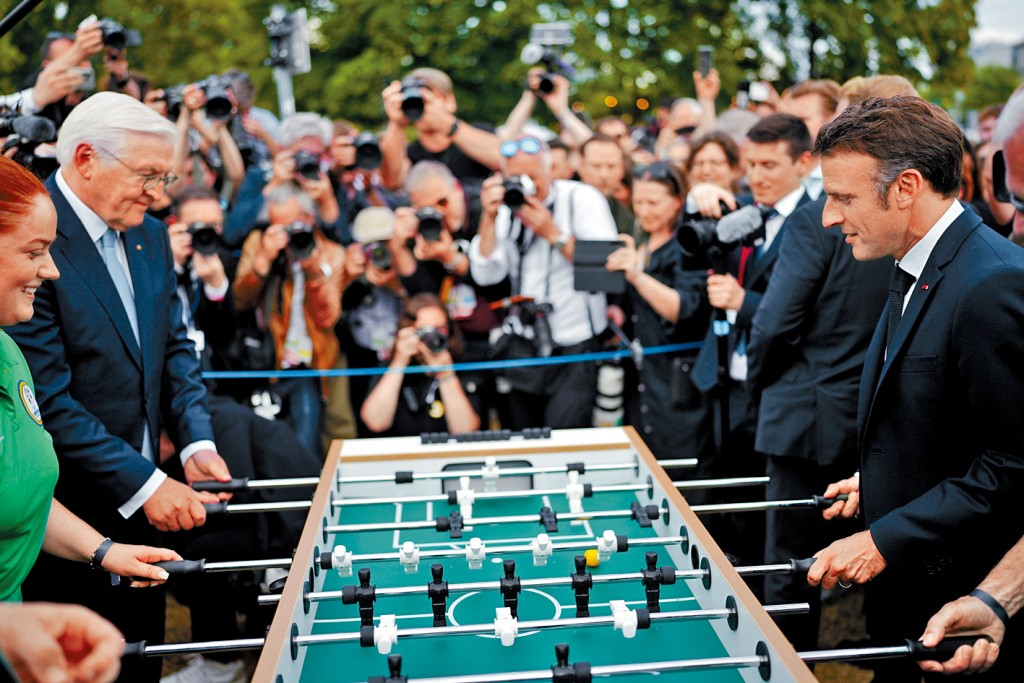 法國總統馬克龍周日抵達德國展開3天國是訪問,與德國總統施泰因邁爾(左)在柏林打了一場桌上足球(見圖),1比1打成平手,營造了是次訪問的友好開端。