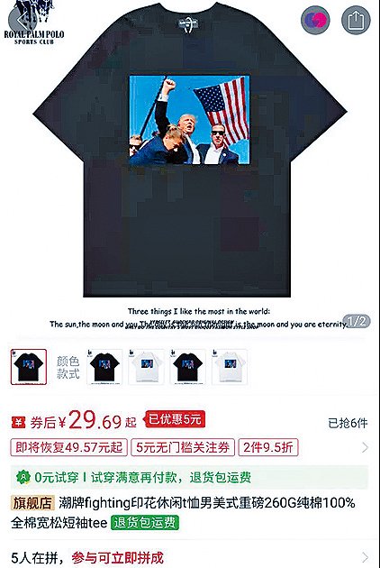 特朗普上周六在造勢集會中槍受傷後不足3小時,淘寶已出現印有這張經典照的T恤,售價34.9元人民幣,有商家接獲逾2000定單。
