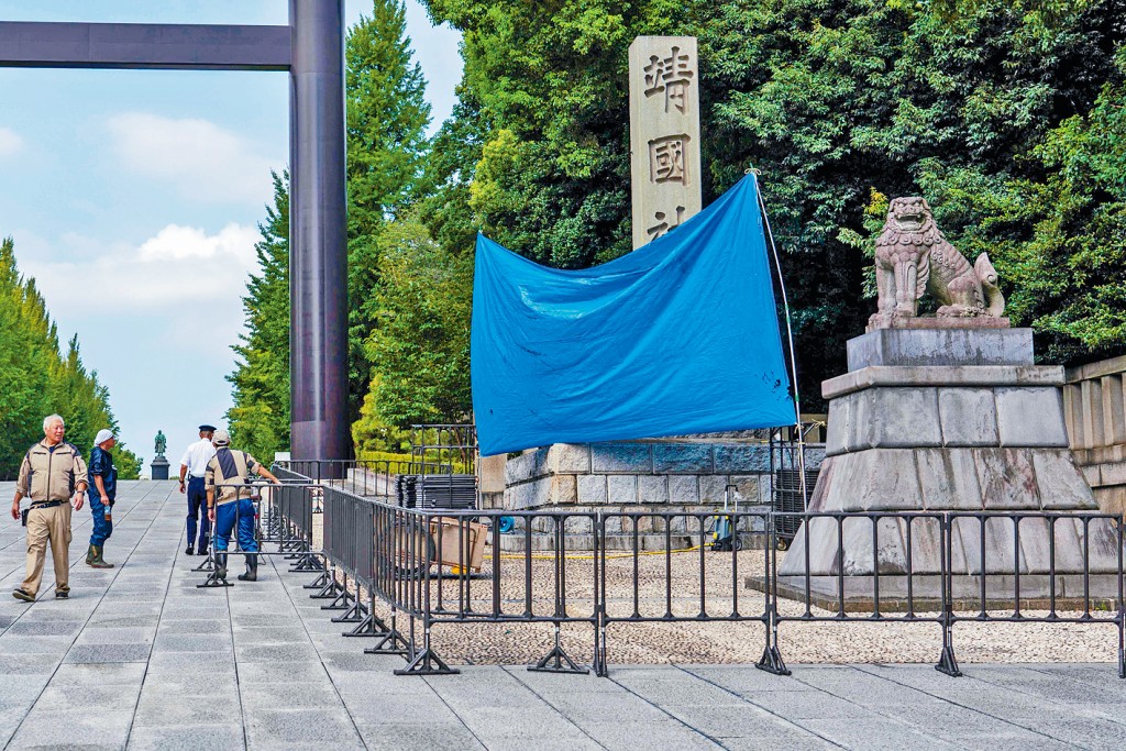 日本靖國神社再度發生塗鴉破壞事件,神社入口附近一根石柱及其底座有6處被塗鴉,疑遭寫上英文字母及以中文簡體字寫有「軍國主義去死」、「廁所」和「狗」等字句。警方正依器物損壞罪嫌展開調查。靖國神社職員於周一清晨約3時50分發現石柱出現塗鴉,隨後報警。今年5月,靖國神社入口處的石柱也曾遭人用紅色噴漆塗鴉,寫上英文Toilet(廁所),東京都警視廳事後依涉嫌毀損財物,以及不尊敬禮拜場所等罪名逮捕1名中國籍男子,並依相同罪名通緝已返回中國的兩名男子。圖為石柱遭塗鴉後被藍布覆蓋調查。