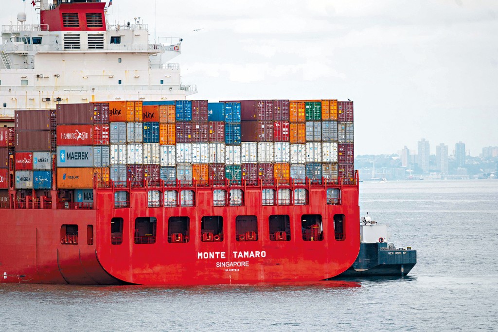 拜登政府呼籲資方提出更優厚的薪酬條件,以在11月總統大選登場數周前終結罷工行動,而資方在白宮的施壓下,在周三釋出願意開啟新一輪談判的意願。圖為貨輪滯留紐瓦克碼頭對開的紐約港。