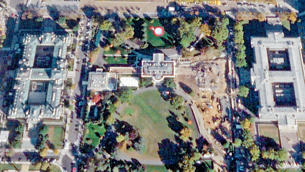 特朗普月前曾承諾,在建造新宴會廳期間不會拆除白宮現有任何基礎設施,而今白宮東翼被完全拆除證其違反承諾。圖為顯示白宮東翼被拆毀的衛星圖。