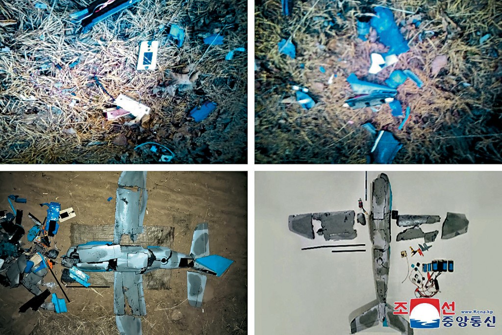 北韓軍方上周六說,繼去年9月的入侵後,1月4日又有無人機從南韓飛入北韓領土,被朝方擊落在開城市一帶,墜落的無人機配備了監視設備。南韓隨後回應稱,這些無人機並非由軍方操作,將徹底調查是否有平民操作這些無人機,並再次明確表達無意挑釁的立場。北韓領袖金正恩的胞妹金與正昨日說,她個人對首爾作出明智決定、公開表明無挑釁意圖表示讚賞。金與正還說,無人機記錄的視頻資料包括鈾礦和朝方邊境哨所。圖為據稱是北韓月初擊落的無人機殘骸。
