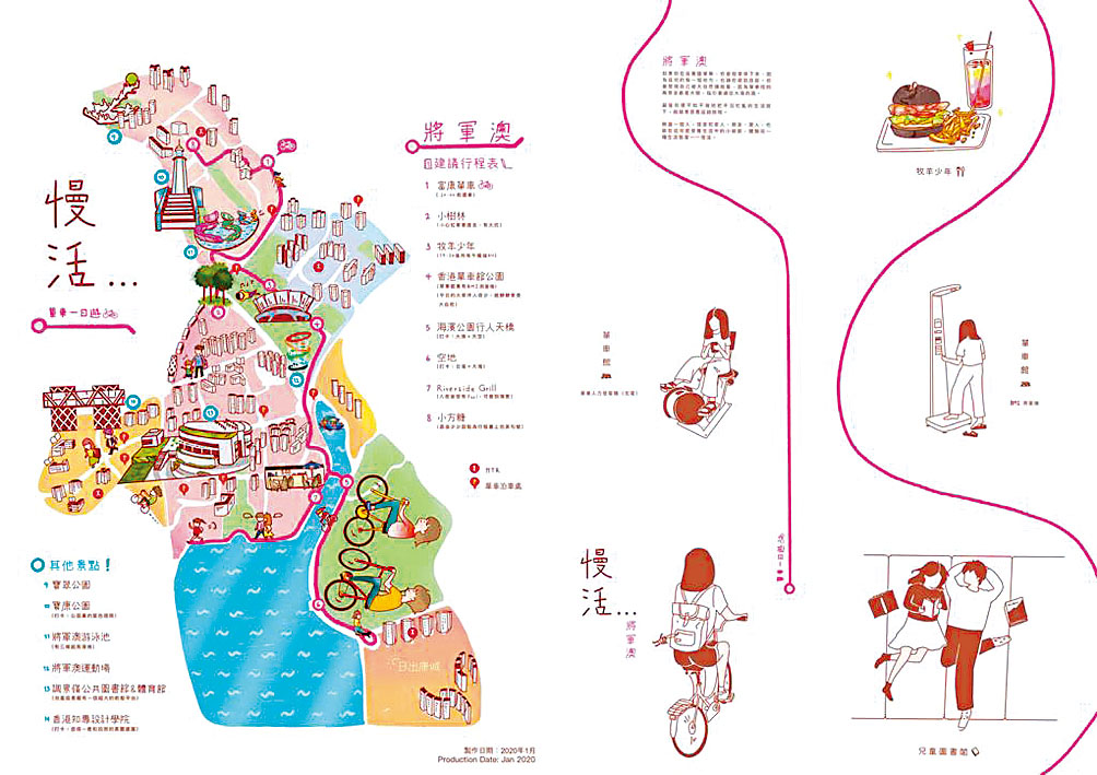 奪得冠軍的林心弦表示,地圖以「慢活」為主題(見圖),親身以單車遊歷整個路線,發掘區內眾多隱世休閒好去處。亞軍鄭燁燁則指,從小就是將軍澳街坊,創作前向區外朋友查詢對將軍澳印象,回應不外乎堆填區和美食沙漠,因此她手繪出充滿美食和回憶地點的社區地圖。季軍李樂欣開宗明義以美食為主題,按實物繪出38家社區特色小店的招牌美食。