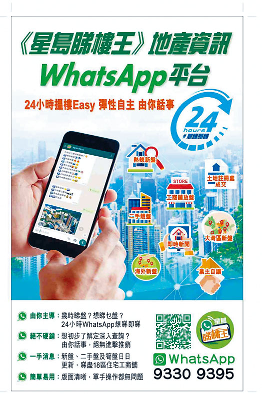 有關更多地產資訊,詳情請留意《星島睇樓王》WhatsApp平台。即按9330 9395加入平台,也可以掃一掃QR CODE,同時亦可Click:https://bit.ly/3ptEzJ8。
