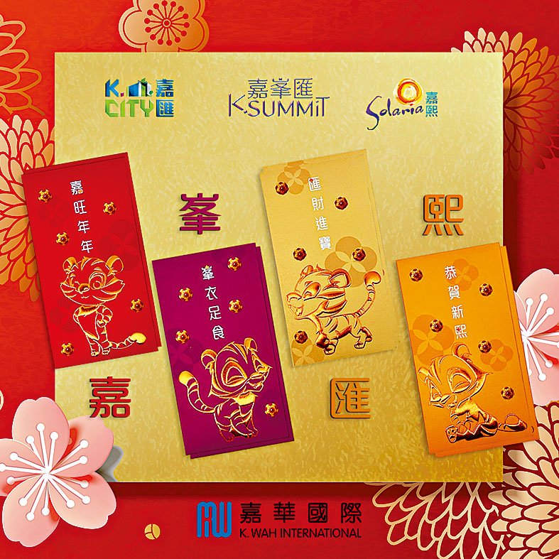(星島日報報道)為迎接壬寅虎年來臨,嘉華特別以旗下啟德嘉峯匯、嘉匯,以及大埔白石角嘉熙三大新盤為利是封主題(見圖),設計以精神炫目的喜慶顏色,配合燙金條勾勒朝氣蓬勃的「賀年金虎」, 並於利是封印上「嘉旺年年」、「峯衣足食」、「匯財進寶」及「恭賀新熙」的賀詞,配搭出嘉華旗下的新盤名稱,設計巧妙之餘亦倍添喜慶。