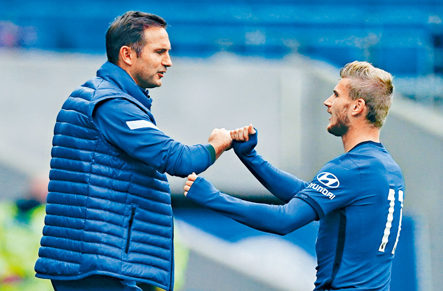 (星島日報報道)車路士周六進行新球季首場熱身賽,新援前鋒迪姆華拿(右)甫開賽四分鐘就建功,領軍作客1:1賽和白禮頓。此外今仗在得到地方政府和英超賽會批准下,有二千二百五十四人入場。