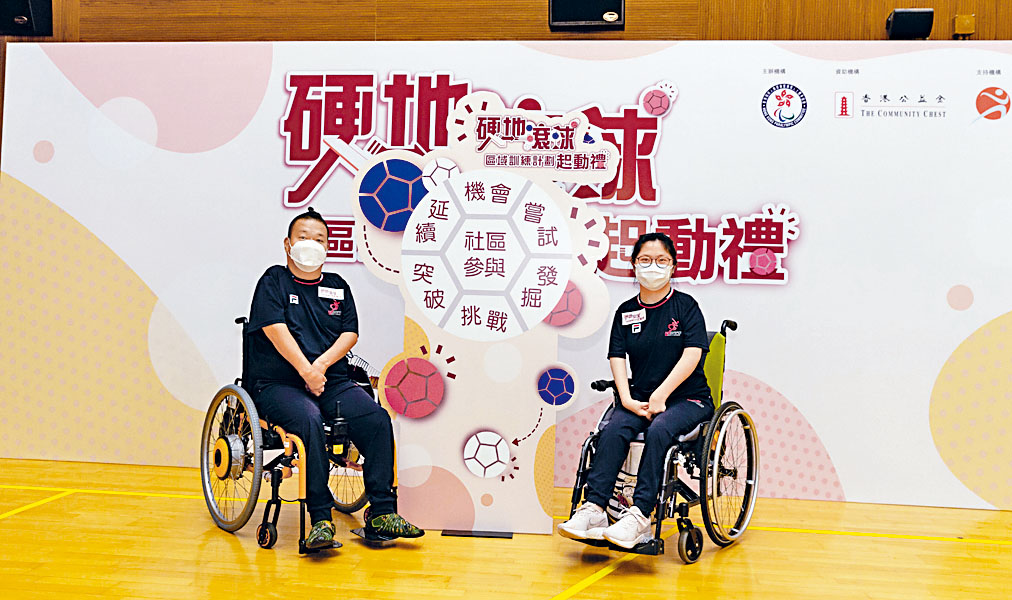 (星島日報報道)硬地滾球區域訓練計畫昨於鄉議局大樓舉行起動禮,計畫將於全港六區為肢體殘疾人士提供訓練。兩屆殘奧金牌得主梁育榮(左)亦到場支持,喜見計畫讓更多人可接觸這項運動。