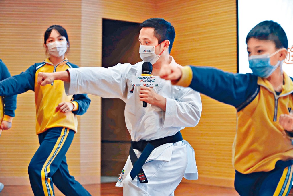 (星島日報報道)陝西全運空手道男子個人形銅牌得主劉知名(中),周三造訪元朗朗屏邨惠州學校跟近三百名小學生見面。這名三十二歲名將穿上道袍,在活動上細說自己早前十字韌帶受傷期間仍保持樂觀,藉此鼓勵同學克服困難、勇敢追夢。他還即席露兩手,讓同學樂在其中。