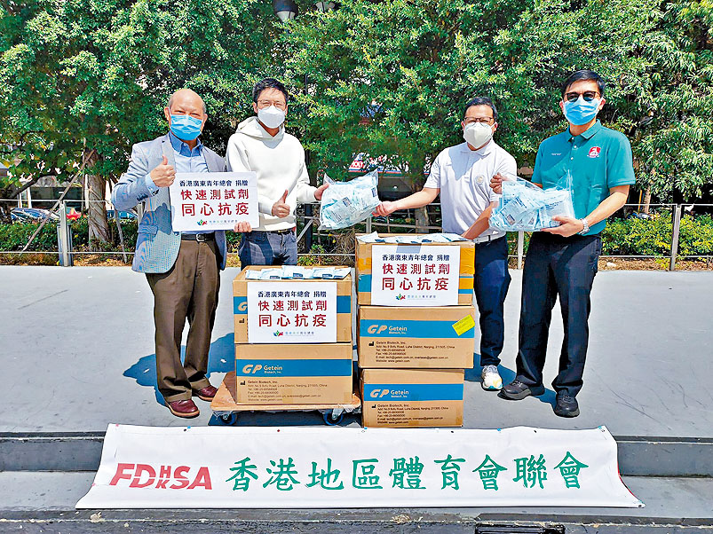 (星島日報報道)本地新冠肺炎疫情日益嚴峻,香港廣東青年總會特意為十八區地區足球隊送上快速檢測套裝。該會主席兼足總副主席霍啟山(左二)等昨先將套裝贈予香港地區體育會聯會,再分發予其他球會,為區隊送上祝福及支持,也期盼盡早重回足球場,感受披甲樂趣。