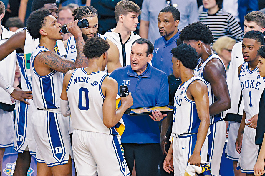 (星島日報報道)早已宣布季後退役的K教練沙薛夫斯基(中),周六帶領杜克大學在全美大學體育協會(NCAA)男籃四強戰,以77:81敗給宿敵北卡羅萊納大學無緣決賽,以冠軍結束執教生涯美夢落空。K教練曾經率領美國三奪奧運男籃金牌,又助杜克大學五奪NCAA冠軍。