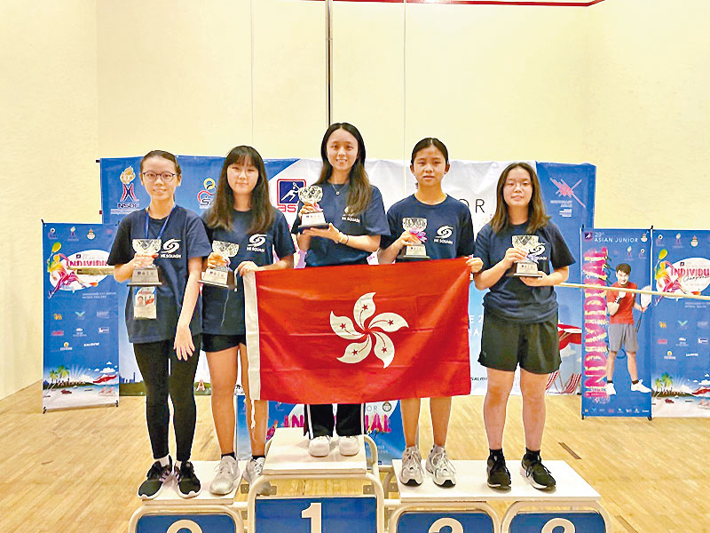(星島日報報道)亞洲壁球青少年錦標賽昨於泰國煞科,港隊女子U19代表黃葆睿(中)、女子U15代表鄺恩琳(左二)和女子U13代表盧沛言(左)皆於決賽落敗,共取得三銀。連同黃慧琦(右二)和張芷晴(右)日前分別奪女子U17和U15銅牌,港隊今屆獵走三銀兩銅。