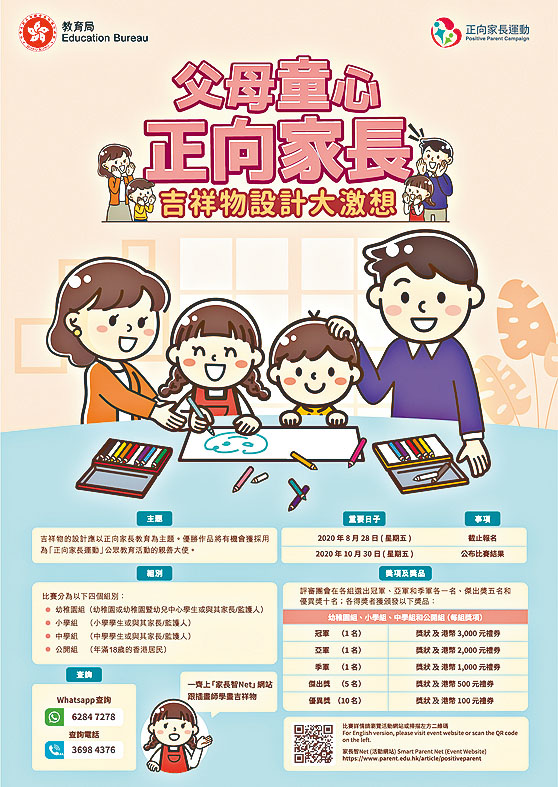 (星島日報報道)為宣傳正確教養子女方法與態度的「正向家長運動」再有新猷,教育局昨向全港幼稚園、中小學發出通函,邀請學校鼓勵師生及家長參加「父母童心——正向家長吉祥物設計大激想」比賽,截止報名日期為八月二十八日。