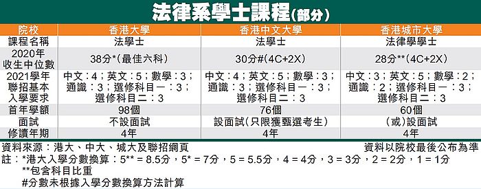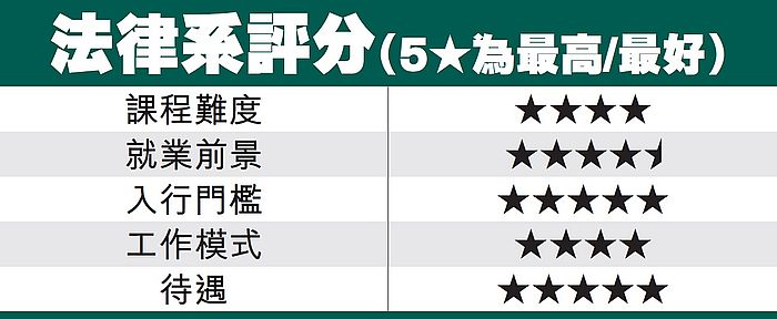 現時全港只有三所大學提供法律系學士課程,包括香港大學、香港中文大學及香港城市大學。去年畢業於香港大學法學士課程的林俊朗,於二○一六年以文憑試最佳六科四十分的優秀成績,入讀該課程。「我中學讀書時喜歡辯論及爭論不同觀點,因此一直對法律系有興趣,準備大學選科時,身邊的朋友和家人都認為我適合讀法律。」