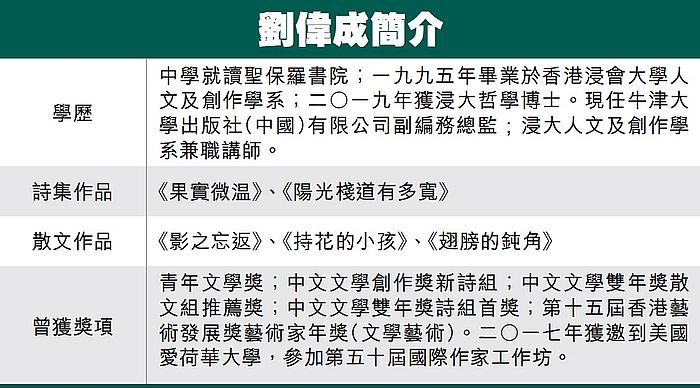對於有志寫作的讀者,劉博士亦分享了鍛煉文筆的小心得,「我平常會翻譯一些外語詩,反覆思考譯成不同字眼的分別,慢慢便會培養對文字的敏感度。」誠然,寫作不能一蹴而就,只可以在日常中慢慢累積,正如劉偉成博士一路走來,不時疏理個人的感受,加上一點一滴的生活經驗,最終才能化成筆尖滲出具生命力的墨水。