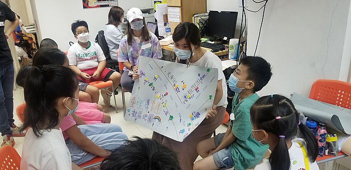 在義工和香港救助兒童會職員指導下,小朋友分成2隊進行活動。每隊先了解自己的社區,事先到現場視察,以五感爲指引揀選心水的景點,再以安全、舒服、有趣、開心等原則制定路綫。他們興高采烈地投入活動,親自設計導賞團的旗幟,動手繪畫及裝飾「童里」地圖,亦製作了其他道具,及仔細地安排團隊內的分工。