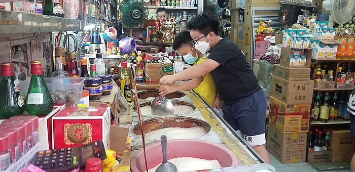 | 第7站: 50年歷史米舖 | 向團友介紹擁有50年歷史的米舖,有別於超巿,街坊可以一斤一斤地把米散買回家,他們還跟店主閒談。 |