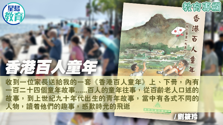 收到一位家長送給我的一套《香港百人童年》上、下冊,內有一百二十四個童年故事,也是香港人的故事,涵蓋一九二○年至一九九六年走過的日子,百人同撰香港之歌,情真意切,一個個真實的故事,道盡了生活中的歡樂哀愁,反映了不同時代的香港面貌,讓我們緬懷過去,思念從前,字裏行間那童心童趣,滿載的親情、友情、家鄉情,讓人回味無窮!