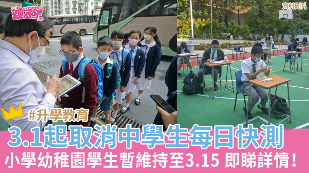 隨著各項防疫措施放寬,中招後隔離令亦已取消,惟學生們的每日快測仍一直保留。今日(21日)教育局向全港學校發信,宣布3月1日起,取消所有中學生每日回校前必須完成一次快測的要求;而小學、幼稚園及特殊學校(包括宿舍部)的學生,則暫時仍須快於每日回校前完成一次快測,措施維持至3月15日。教育局指會檢視情況,再於適時公布日後的各項學生防疫安排。