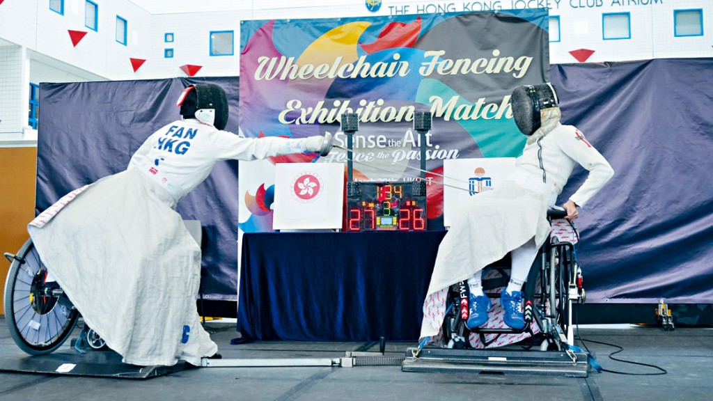 科大昨於校內賽馬會大堂舉行輪椅劍擊表演賽,邀請香港輪椅劍擊隊隊員范珮珊、鍾婉萍及湯雅婷,與科大劍擊隊成員莫彤菲、林琼及徐嘉熹對壘,吸引逾300名師生觀戰。比賽分3輪進行,率先取得30分的隊伍勝出。港隊於前兩局一直領先,雙方於決勝局鬥至29比29平分,港隊最終取得關鍵1分,險勝科大劍擊隊。