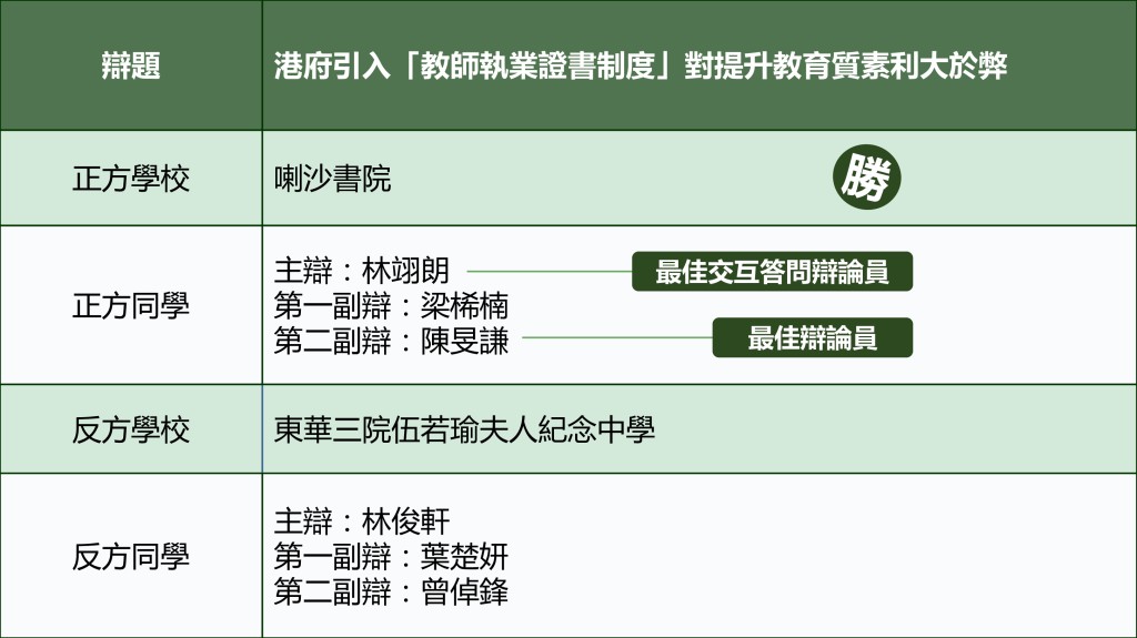 正方喇沙書院對反方東華三院伍若瑜夫人紀念中學的一場賽事,辯題為港府引入「教師執業證書制度」對提升教育質素利大於弊。