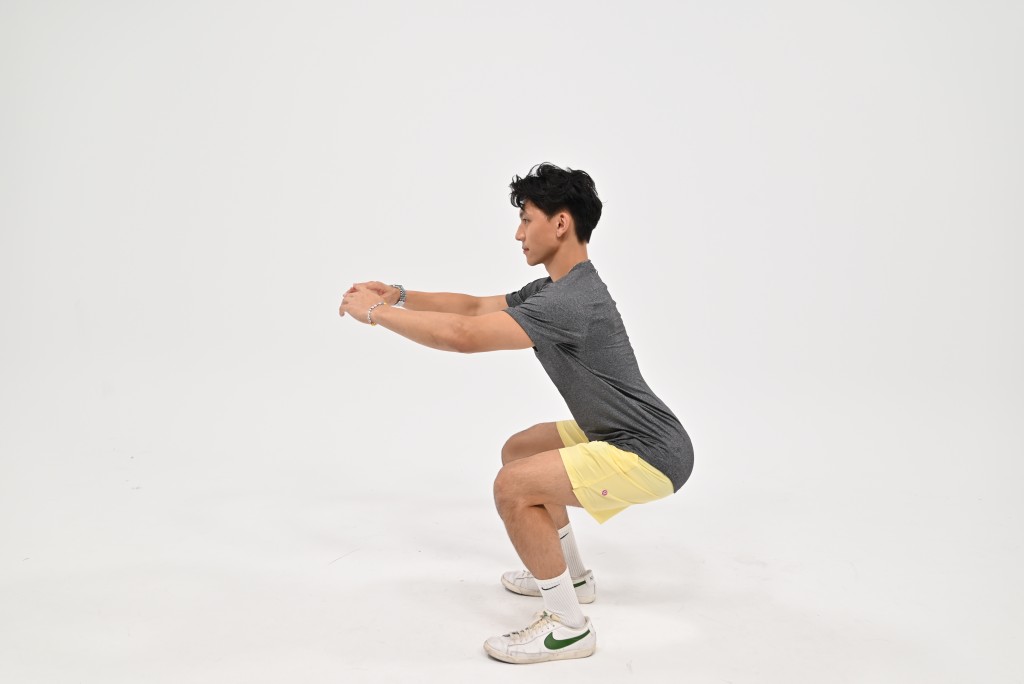 深蹲。雙腳與肩膊同寬,身體保持直線,像無影櫈坐下去,膝蓋不要超過腳尖以免超伸,感覺到大腿和臀部的肌肉再發力,建議每日做三組,每組做十次。
