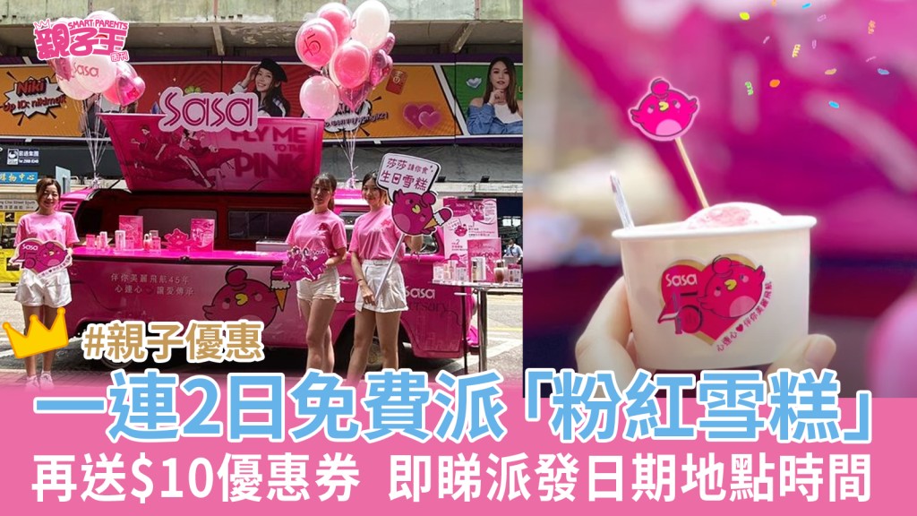 於香港成立快將45年的莎莎,今年為45周年舉辦一系列慶祝活動,更以「伴你美麗飛航45年、心連心•讓愛傳承」為題,推出多個優惠。粉紅色為莎莎的標誌色,所以莎莎特別於今日(15日)及明天(16日),在旺角、尖沙咀及銅鑼灣大派粉紅雪糕,於指定時段見到莎莎雪糕車,只需讚好或追蹤莎莎官方Facebook 專頁(Sasa Hong Kong 莎莎香港)及Instagram 帳號(sasahk_official),即可獲贈粉紅生日雪糕1杯!
