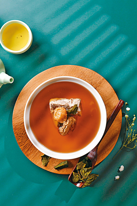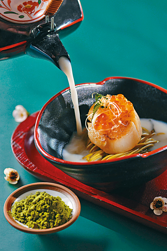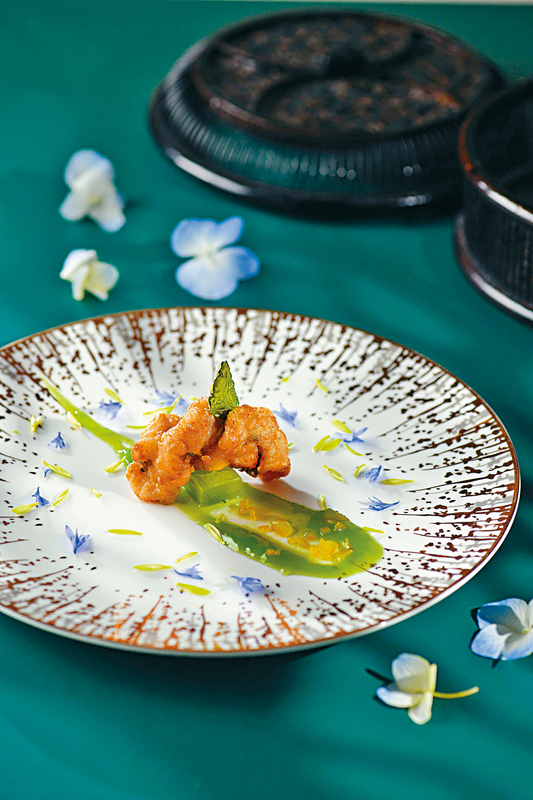 先奉上前菜花薈,以洛神花、紅棗、山藥砌成鮮花模樣,配上蓮藕片及涼瓜等,清新香甜,可喚醒味蕾。另一道洞庭碧螺春柑橘脆鱔球,將鱔球炸至金黃香脆,配以碧螺春與柚子汁調成的醬汁,增添香氣。至於觀音梅子口蘑肉骨茶,以軟腍的豬軟骨與口蘑菌入饌,加入鐵觀音和梅子燉上三小時,入口香濃回甘。嫩滑的蜂蜜玫瑰情人茶燻銀鱈魚,以養顏的玫瑰情人茶燻熟銀鱈魚,再塗上蜂蜜,添上香甜味道。中日合璧的煎北海道帆立貝昆布鰹魚綠茶麵,以煙韌的綠茶麵,配上昆布鰹魚湯與煎至金黃的原隻北海道帆立貝,口感豐富。其餘鹿茸菌蒙頂鳳凰卷配西班牙焦糖幼梨、人參烏龍蕎麥煎釀關東遼參、茉莉蘆薈五彩岩米玉露配宇治抹茶香芒卷,各具誘人風味。