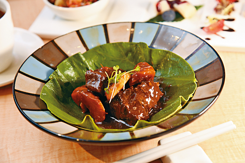 至於高湯干貝燴花膠羹,要先把元貝及花膠預先浸發及蒸煮,再放入用大量老雞、赤肉及火腿熬至少六小時的高湯中,慢火燴煮至味道互相融合,入口鮮美清甜。此外,鬆化肉嫩的荷香花雕滷燉和牛面頰,梁師傅精挑肉味濃郁、肥瘦均勻的澳洲和牛面頰肉,加香料與花雕酒燉四小時後,再包上荷葉蒸十五分鐘,令牛肉多了一分清香。