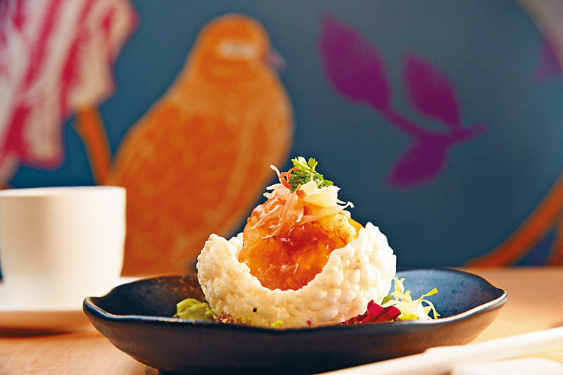 像是名為悠然的晚市套餐,可以吃到由櫻花蝦怡香脆茄子、冰藍莓鮮淮山和水晶肴肉組合而成的前菜拼盤,並有工序繁複的巧手高湯干貝燴花膠羹、日本柚子醋窩巴脆蝦球及荷香花雕滷燉和牛面頰。日本柚子醋窩巴脆蝦球的做法,是將原隻大虎蝦蘸上一層薄薄的炸漿,炸至蝦肉剛好熟,放於風乾三日再炸脆的窩巴上,奉客前才淋上日本柚子醋汁,酸香開胃又爽脆彈牙。